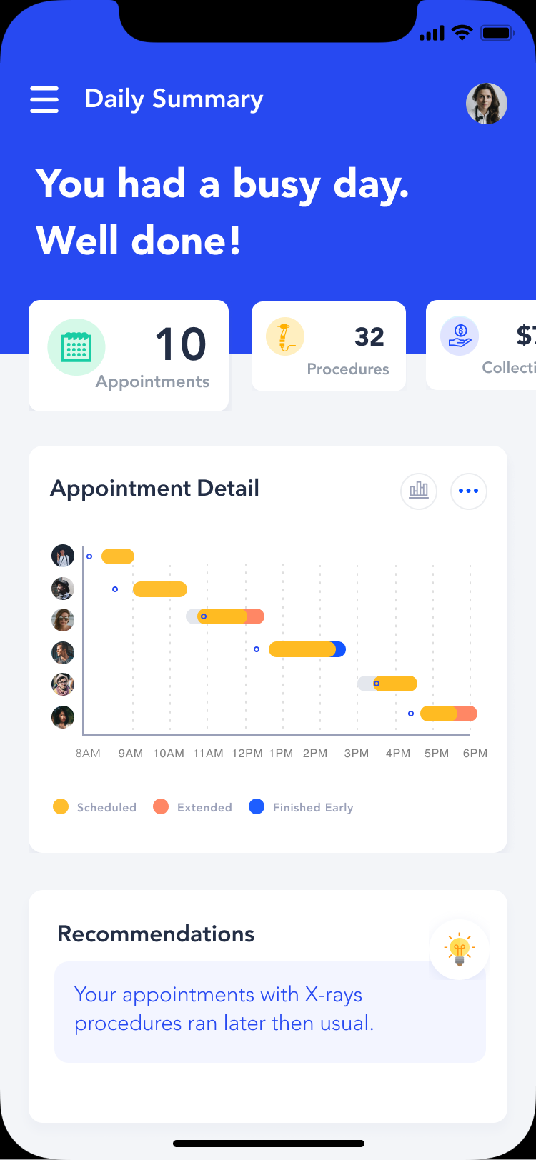 The goal for the app was to create a handful app for the dentists what would help them track their patients together with time and earnings and boost their mood during the working day with advices.