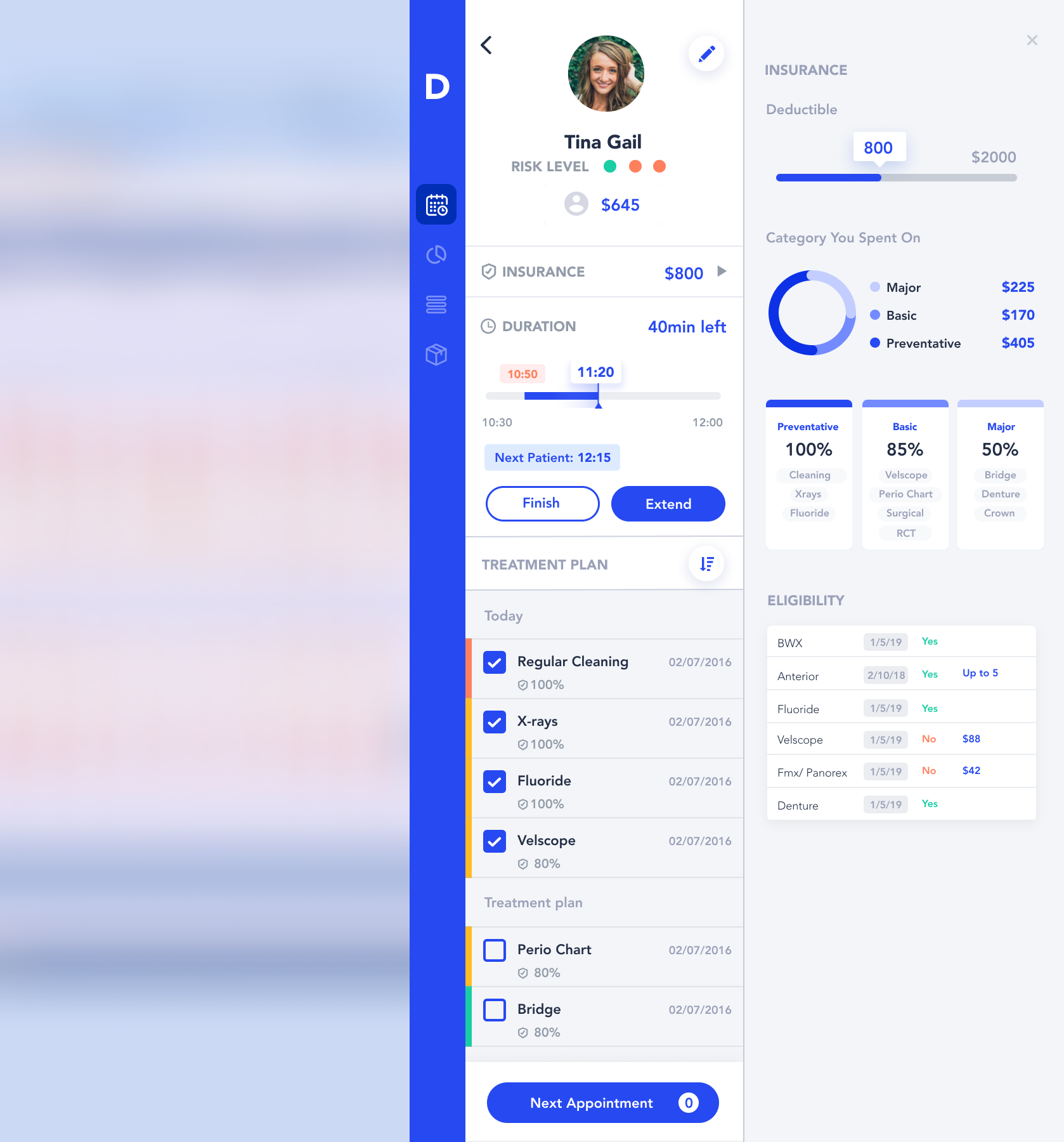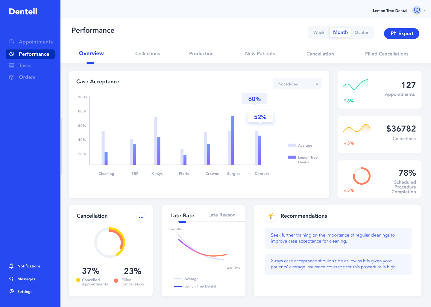 Full screen view allowed to view all the performance metrics to track dentists progress and give them advice on how to ease their work.